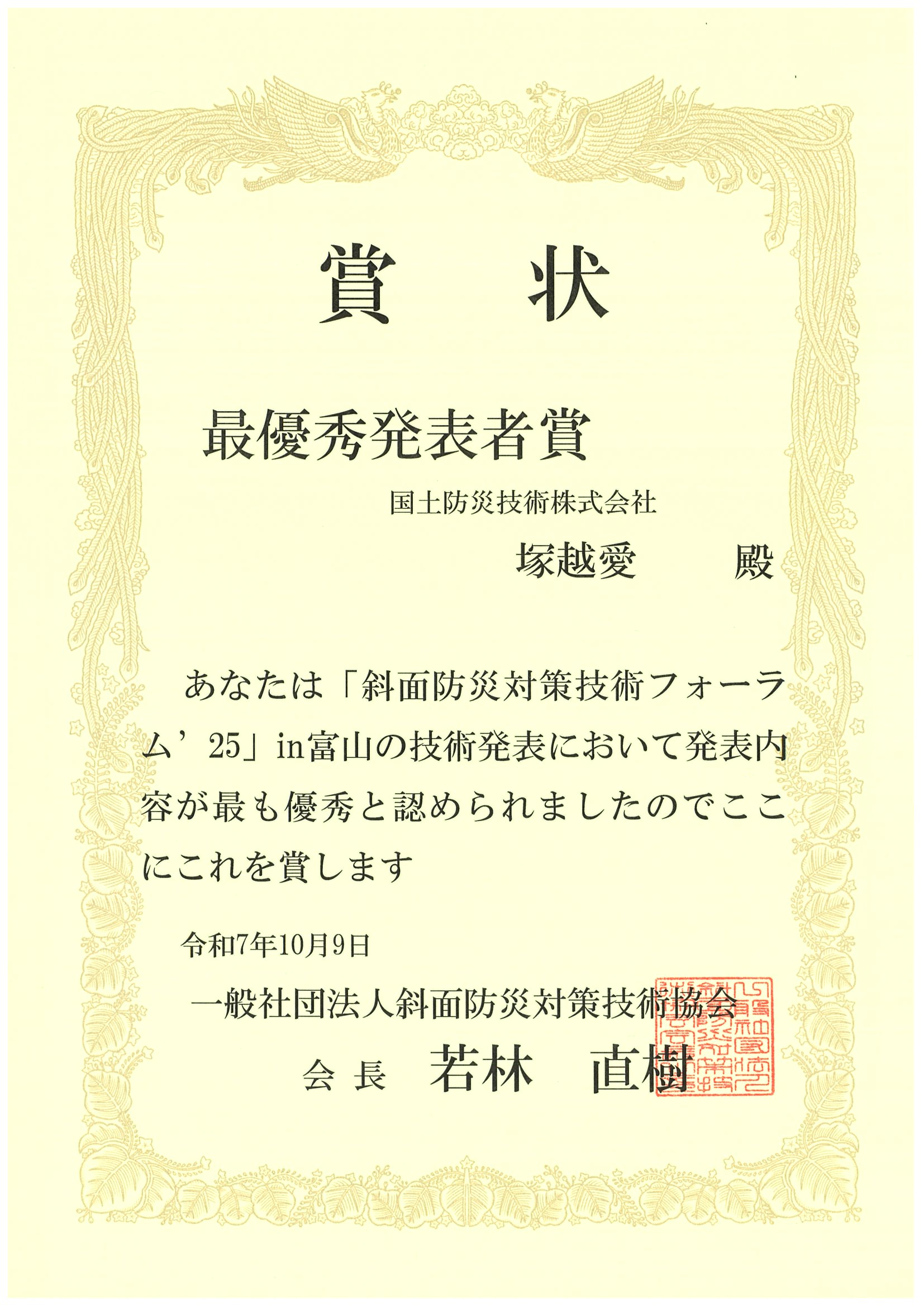 斜面防災対策技術フォーラム’25 in富山にて最優秀発表者賞を受賞しました!