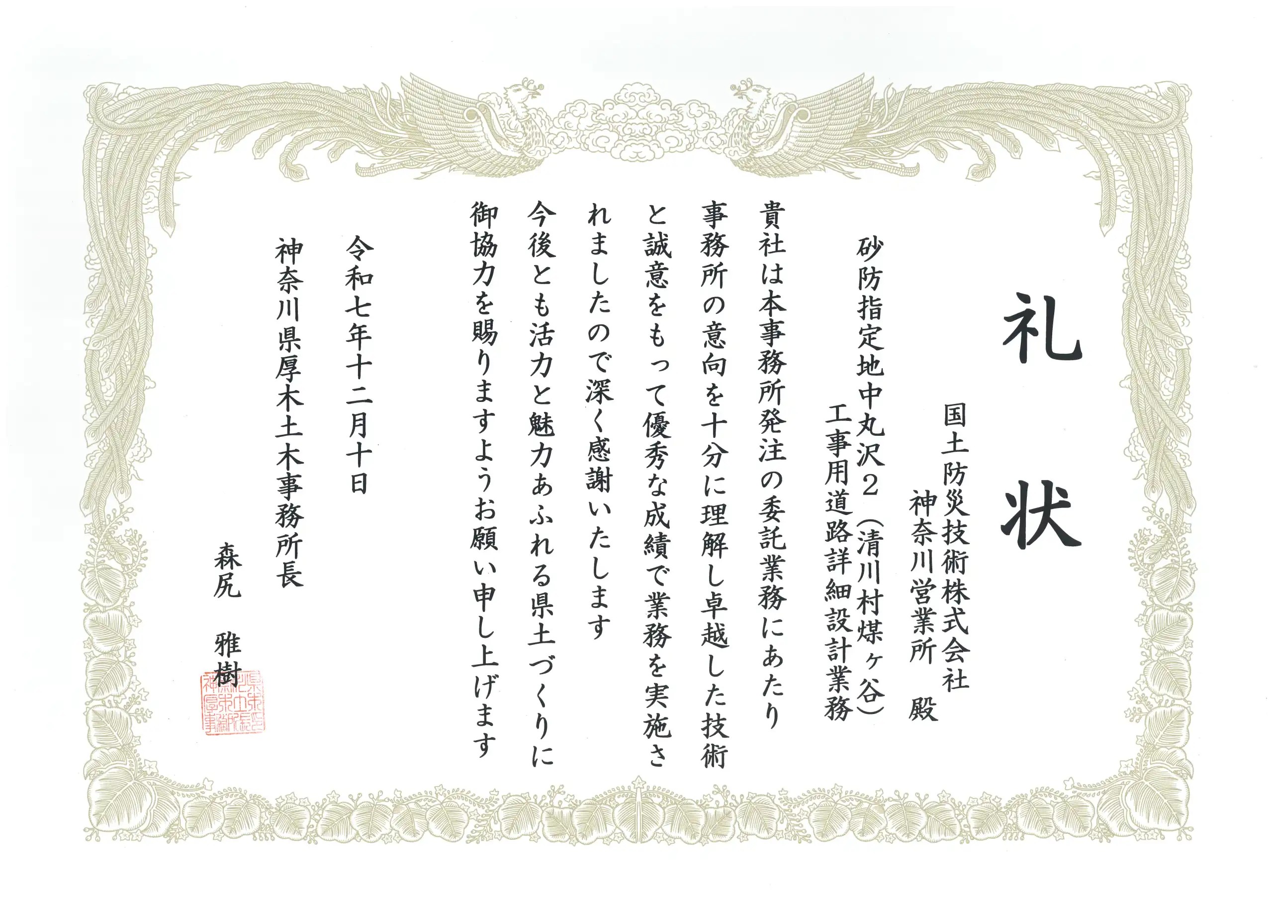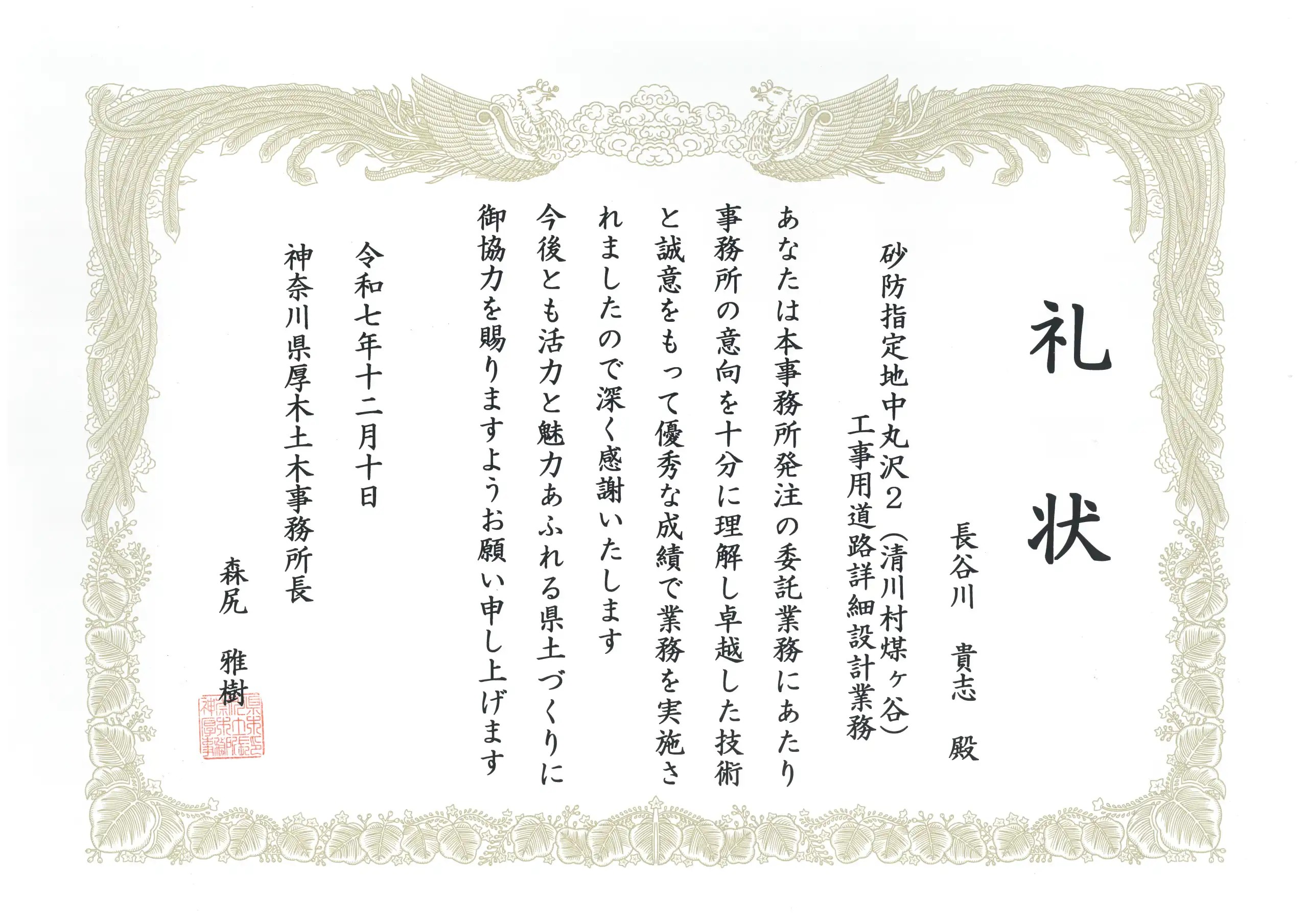 神奈川県厚木土木事務所長より、令和6年度に受注し実行した業務について礼状を頂きました。