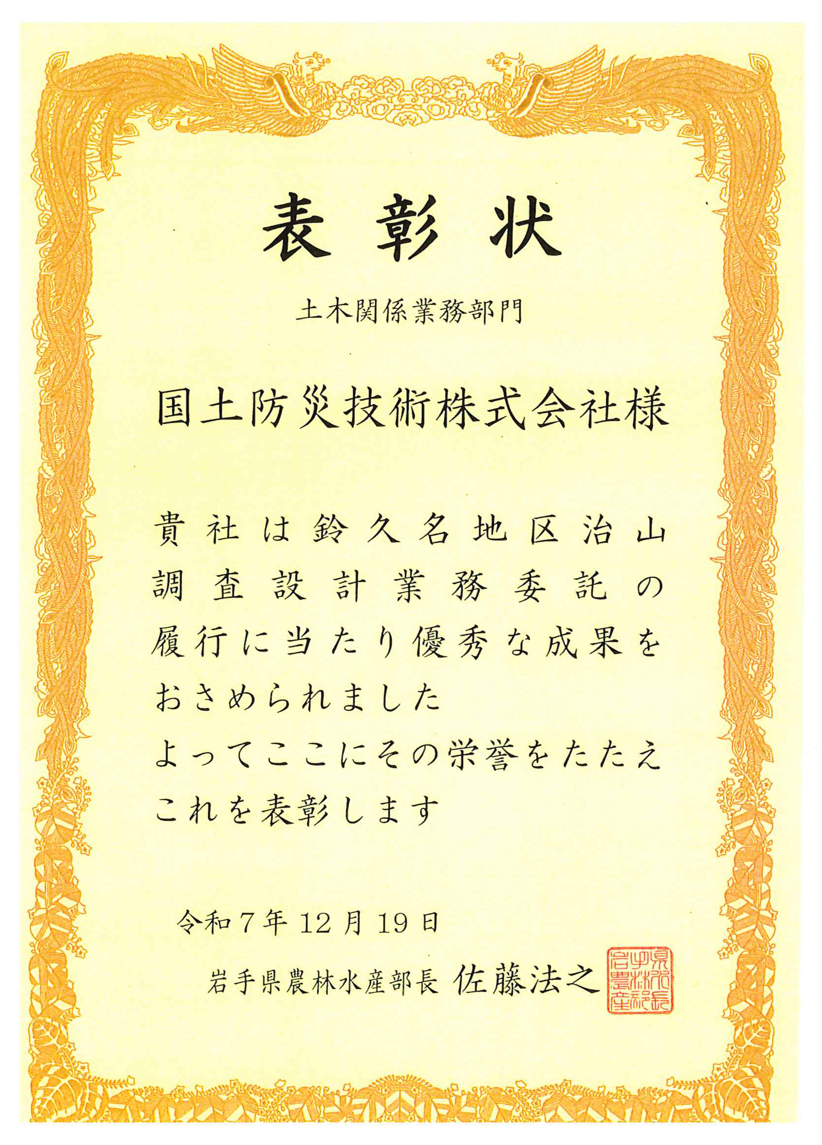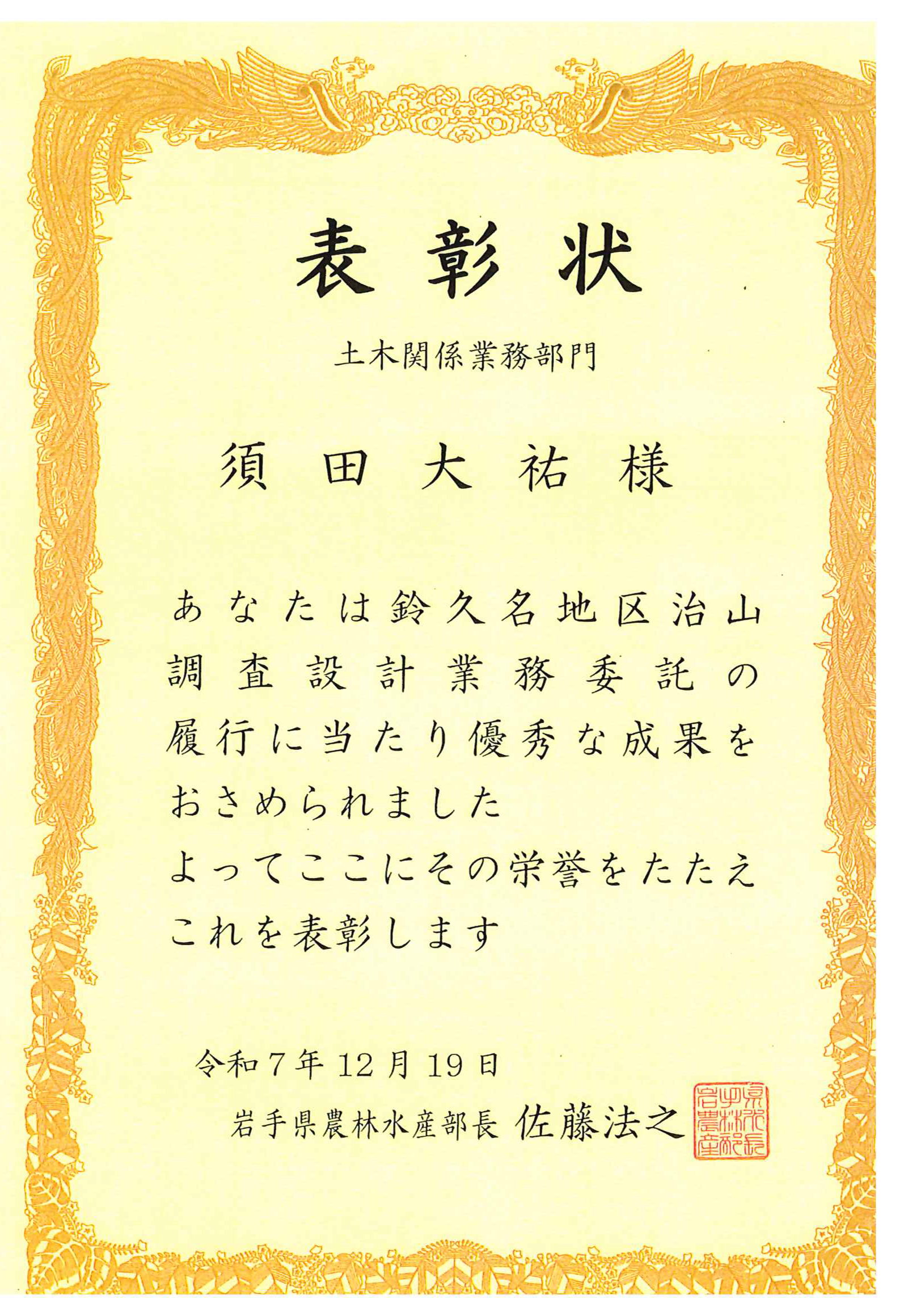 岩手県農林水産部より、令和7年度岩手県農林水産部優良建設関連業務表彰を頂きました。 この表彰は、農林水産部所管(農村整備、森林保全、漁港漁村)の公所が発注する建設関連業務において、優秀な成績を収めた受注者及びその業務を担当した技術者に贈られます。