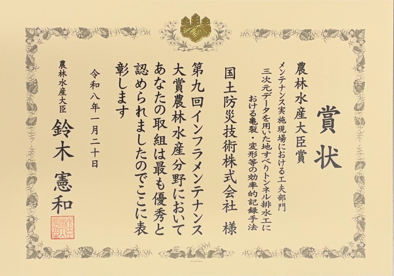 当社が、第9回インフラメンテナンス大賞 農林水産大臣賞を受賞しました。