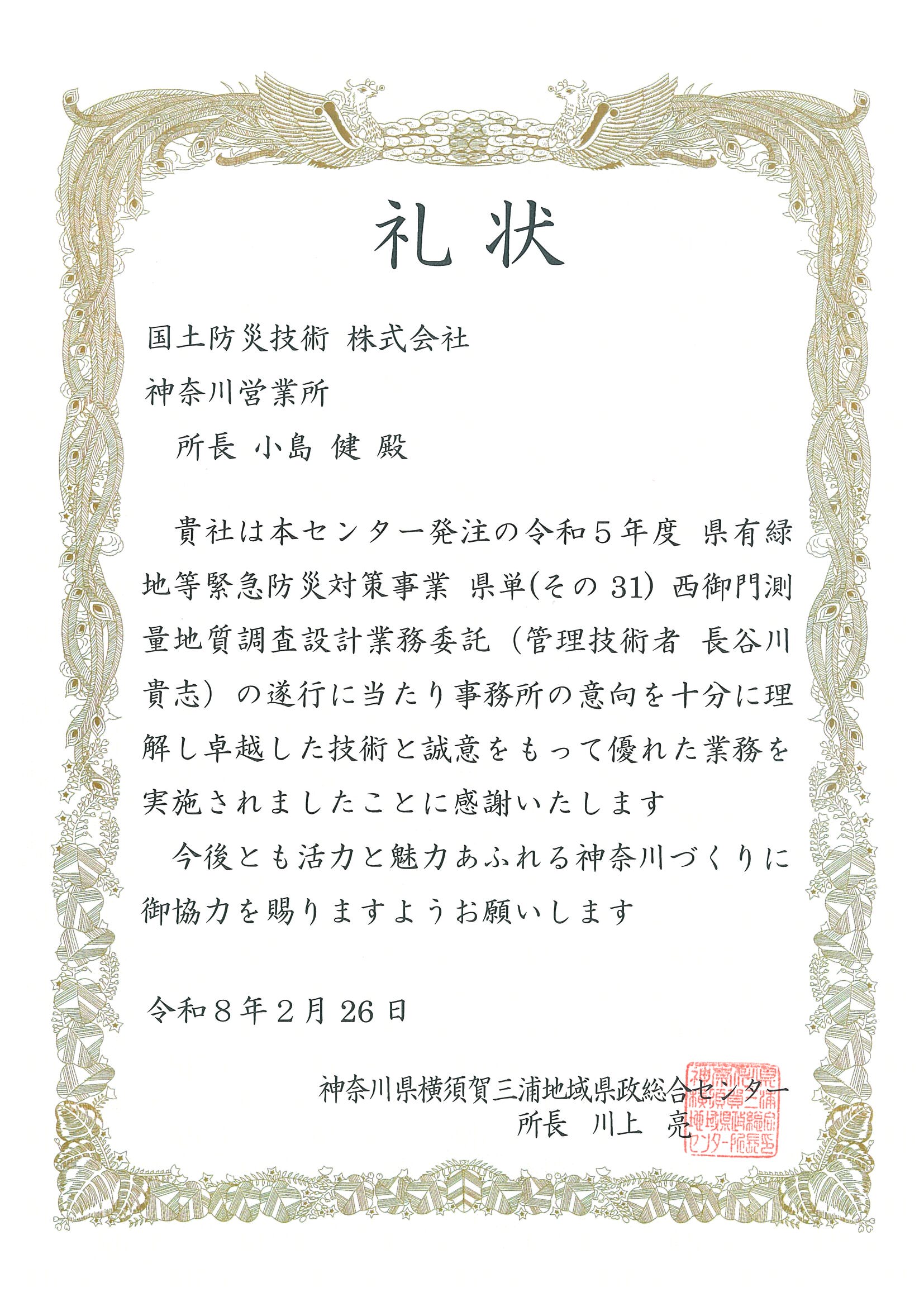 神奈川県横須賀三浦地域県政総合センター所長より、昨年度受注し実行した業務について礼状を頂きました。